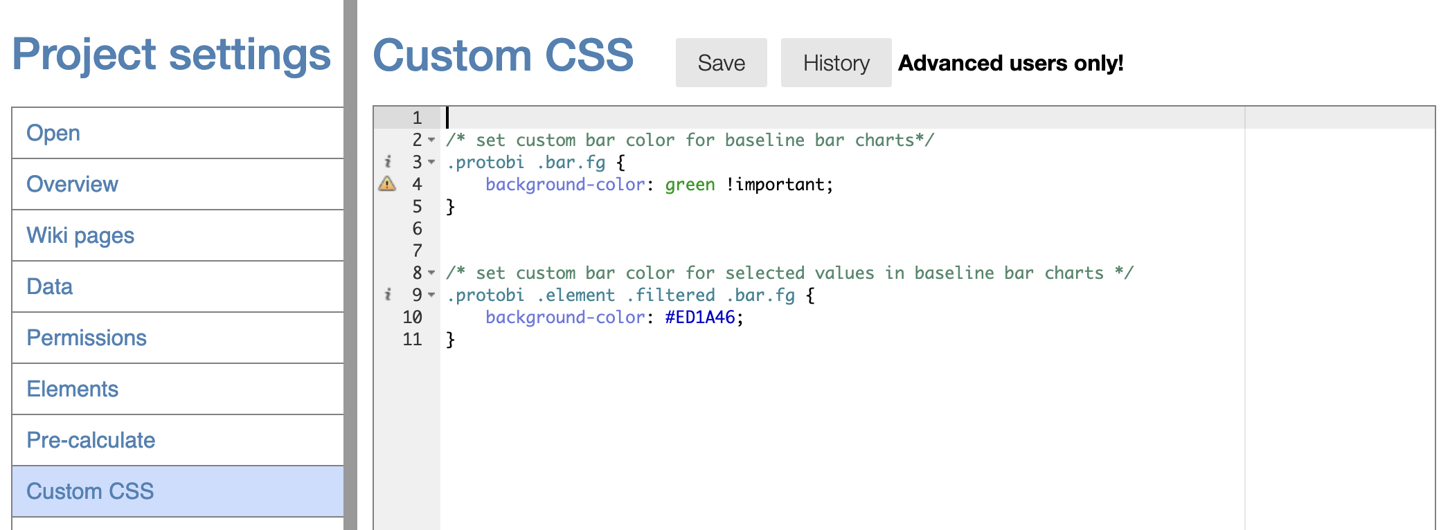 Protobi lets you tailor the visual appearance of your survey dashboard using standard CSS ("Cascading Style Sheet" syntax). Navigate to your Projects Settings page and open the Custom CSS tab: