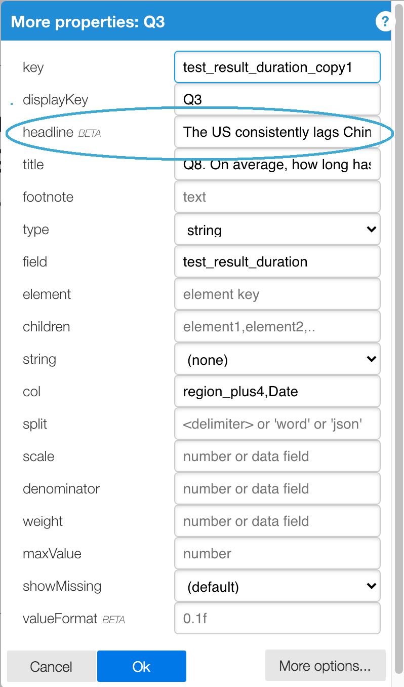 The bold text that appears below the element header is the headline . It's another new feature that can help you tell the story. The headline for an element should contain the key takeaway from the chart. Many elements may not need a headline.